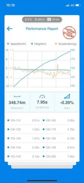 100-200km/h vorläufig korrigiert 8.04 sec. was für einen 6 Gang DSG bei dem Gesamtgewicht sehr o.k. ist.