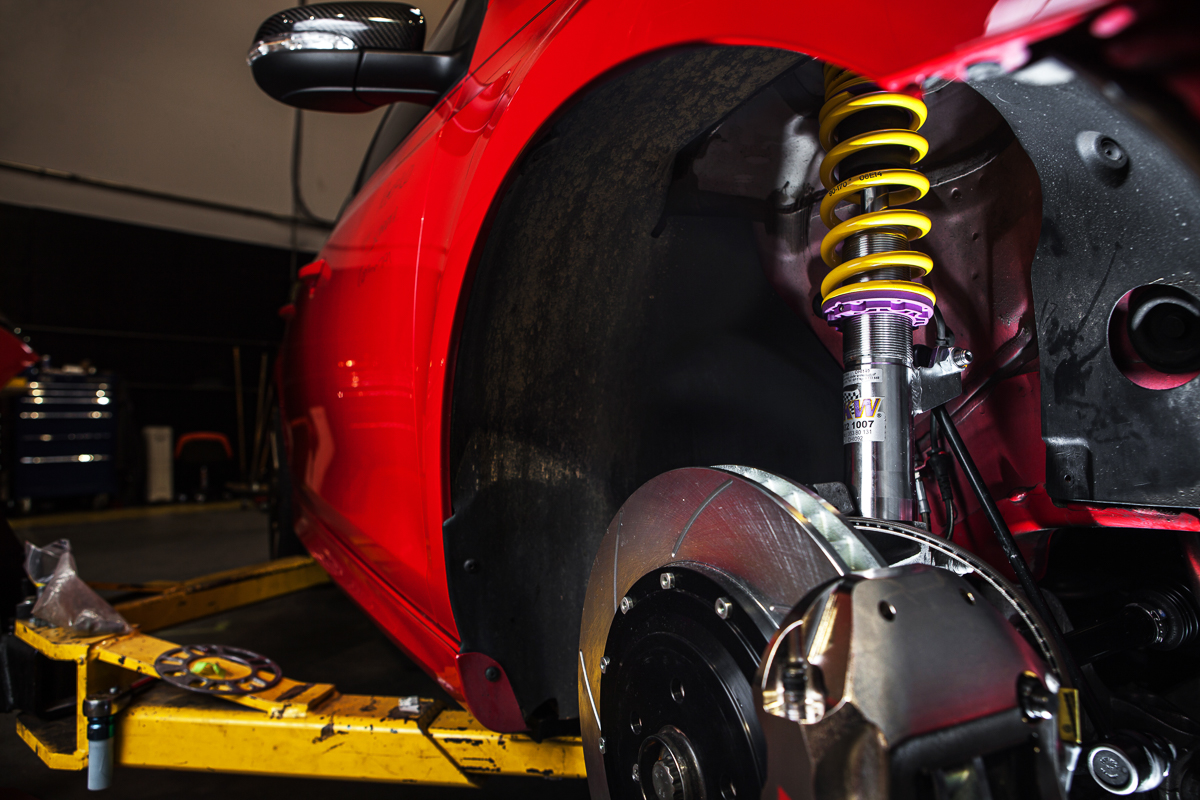 KW Clubsport 2-way Gewindefahrwerk. Das separat in der Zug- und Druckstufe einstellbare Clubsportgewindefahrwerk mit seinen Rennsportfedern den Hochleistungsdämpfern und Nürburgring Nordschleifenabstimmung ist das ideale Performance-Fahrwerk für den 745 PS Sechser-Golf. Dadurch ist es ein Leichtes das ideale Setup für jede Rad/Reifenkombination, Strecke usw. einzustellen. Werden die Zugstufenkräfte erhöht, steigert sich das Handling des KW Clubsport Gewindefahrwerks weiter. Komfortabler wird die Abstimmung durchs Reduzieren der Zugstufenkräfte.