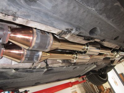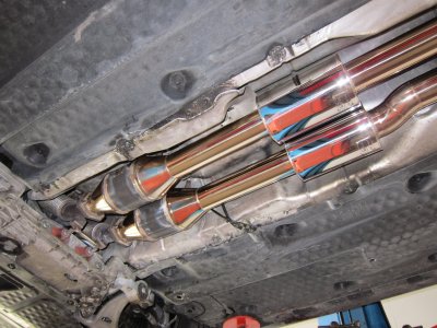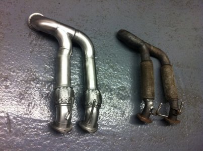 Rein von den Bildern tippe ich auf einen 3'' (76mm) Ausgang der Downpipe, welches sich kurz danach in 2x70mm aufteilt. Auch hätte ich gesagt, der doppelflutige Teil sind 2x70mm, 76mm doppelt wäre schon arg sportlich vom Platz her. Rein von den Werten passt es bei der Abgasanlage, nur finde ich es suboptimal die Downpipe so früh zu teilen, sollte für die 500 PS aber ausreichen. Meine wird erst kurz vor den Kats doppelflutig.Wieviel die Downpipe hat weiss ich leider nicht, es ist so das maximum was so reinpasst. Ich meine es war um 1" größer als HGP. Danach geht es mit 2x3" weiter und dann auf 1x3,5"