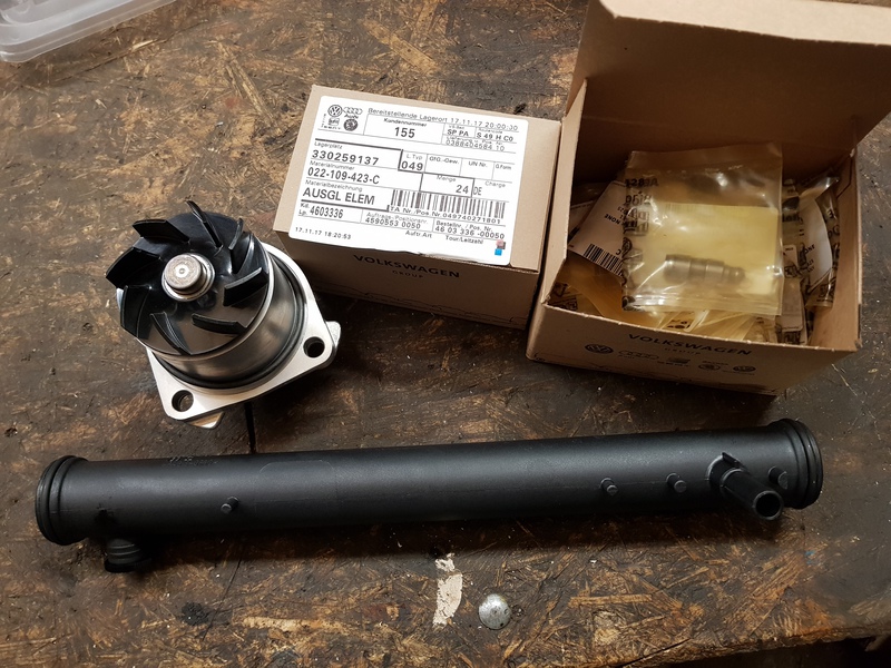 Hab vorhin nochmal paar Teile abgeholt. Neue Ausgleichselemente, neue Wasserpumpe und nen neues Wasserrohr...