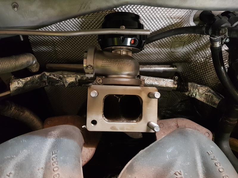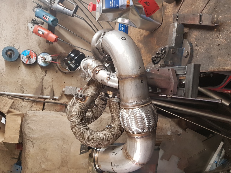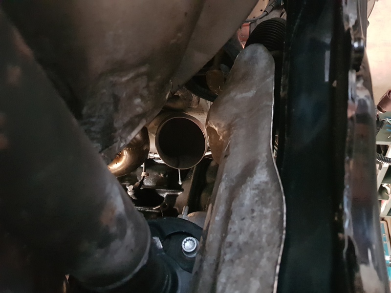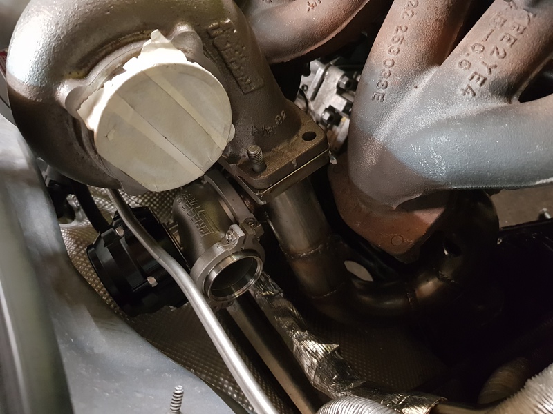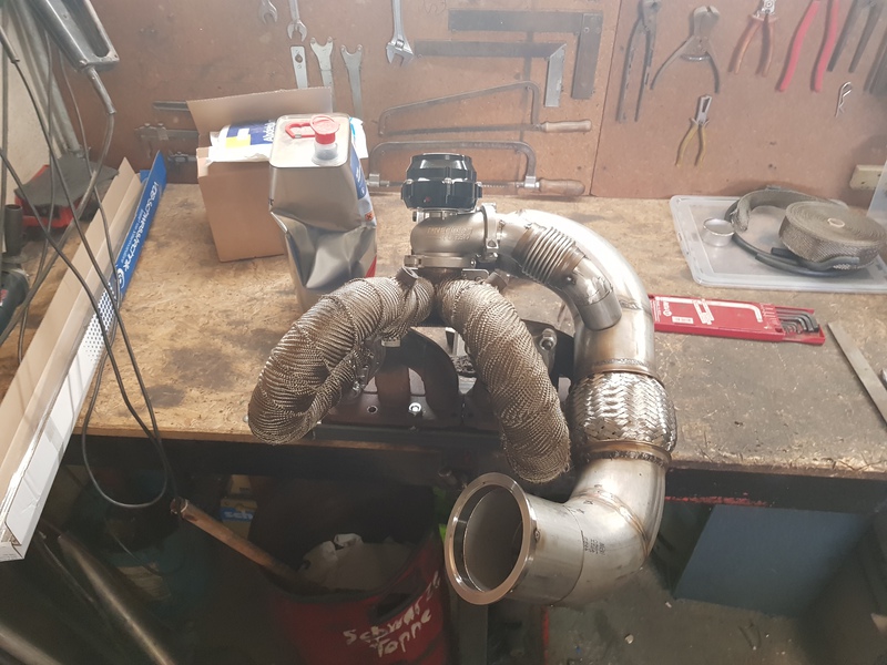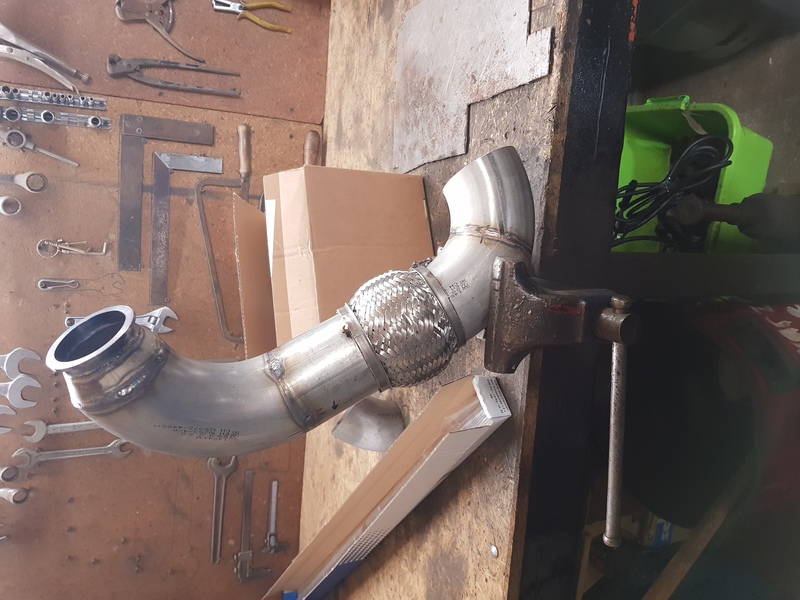 Dann Downpipe in 89mm gebaut, die hab ich 2-teilig gebaut wegen den Platz am Lenkgetriebe. Wenn ich die Downipe ausbauen will, löse ich nur die V-Band Schelle im Motorraum, und brauche sie nicht immer durch den Tunnel zu friemeln: