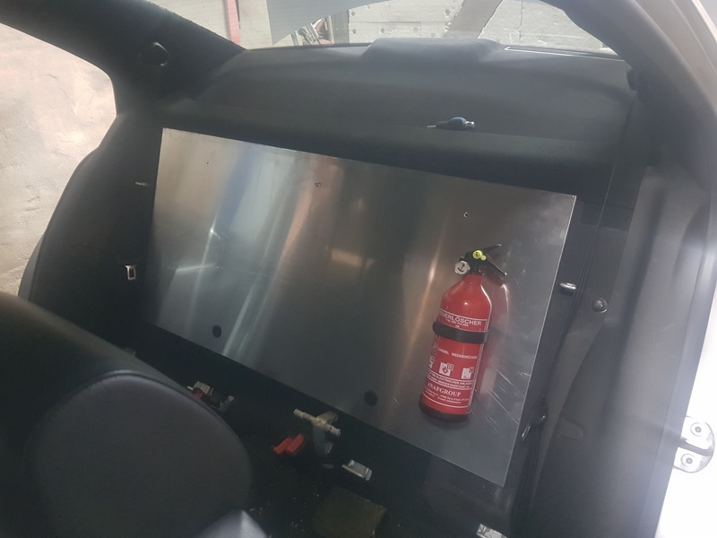 Habe mir eine Alu-Platte besorgt, worauf auch gleich der Feuerlöscher angeschraubt werden kann. Die Platte wird noch bezogen.