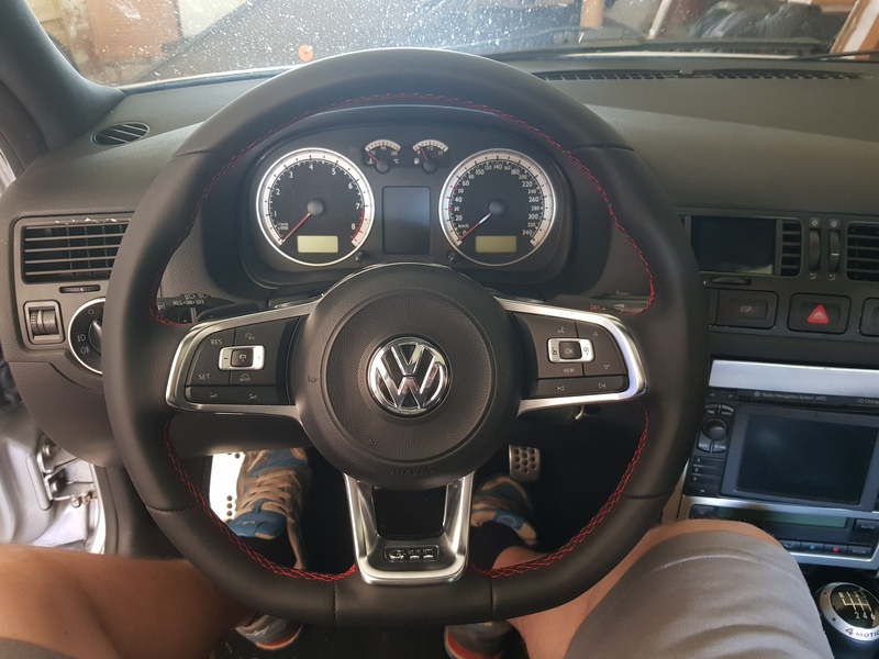 Dann anderes Lenkrad eingebaut, da das alte Optisch iwie nicht mehr passte. Zudem habe ich auch eine neue obere Lenkradverkleidung verbaut.